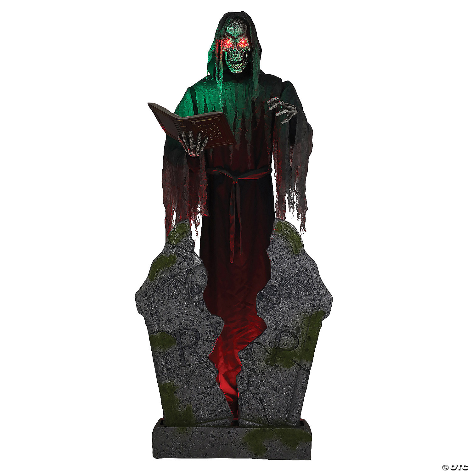 Transforme sua decoração de Halloween em um verdadeiro cenário de terror com este impressionante enfeite animado. O ceifador, vestido com manto preto rasgado e capuz, segura um livro misterioso enquanto se ergue atrás de uma lápide rachada e coberta de musgo artificial, criando um efeito assustador e realista.