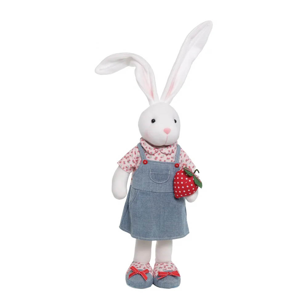 Disponível nas cores branco com azul e vermelho (sortido), o coelho aparece em pé, vestindo jaqueta com touca e vestido, além de acessórios que enriquecem o visual. Seu acabamento de alta qualidade prioriza a textura macia, costura reforçada e excelente padrão de enchimento, garantindo um produto bonito e durável.