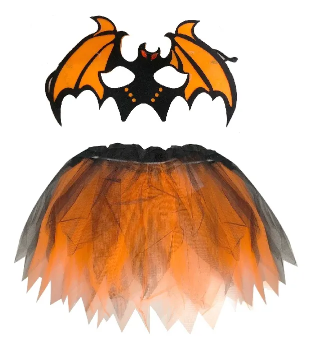 O Conjunto Halloween traz saia temática e máscara de morcego nas cores laranja e preto, perfeitas para festas, escola, truques ou travessuras e eventos temáticos.