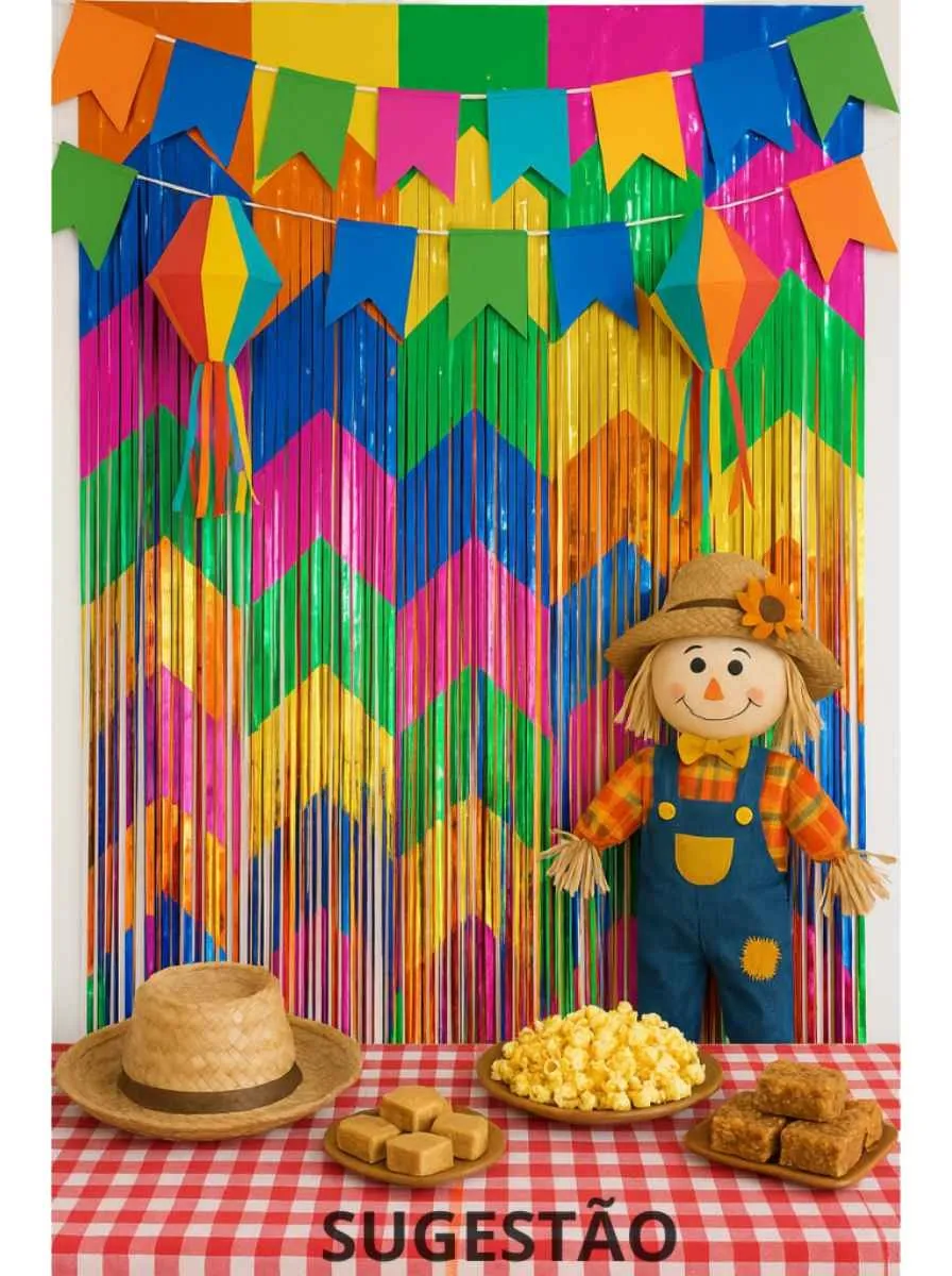 Transforme sua decoração com muito brilho e cor! A Cortina Metalizada Festa Junina é perfeita para criar um painel incrível e destacar ainda mais o clima de São João na sua festa.