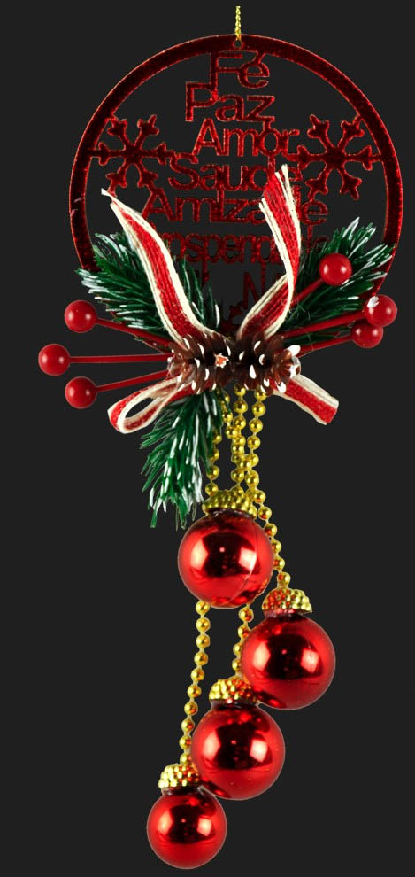 Enfeite pendente com palavras natalinas (como Feliz Natal, Boas Festas, etc.)