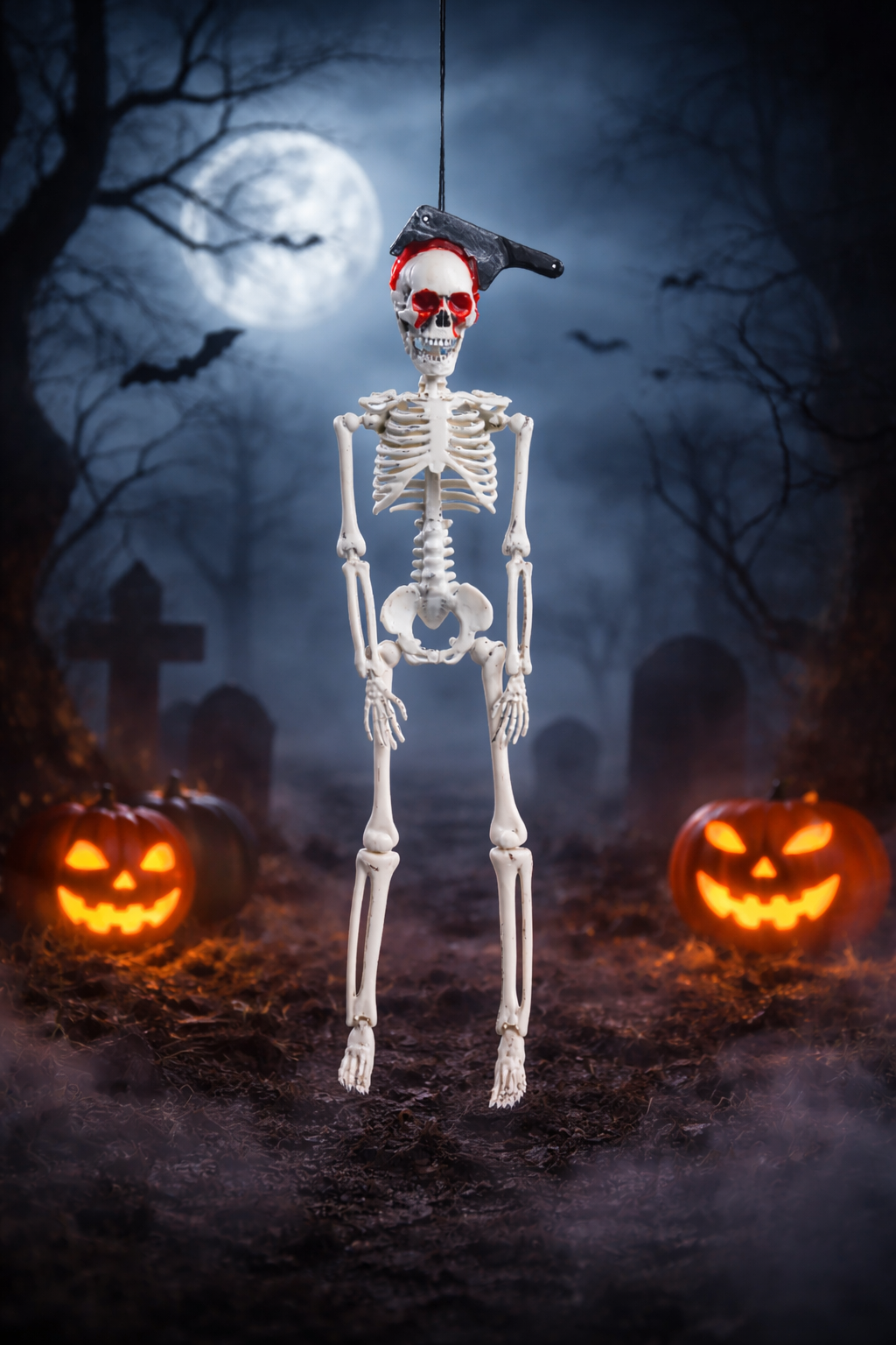 Deixe sua decoração de Halloween ainda mais aterrorizante com o Esqueleto com Faca na Cabeça! Com visual sombrio e cheio de personalidade, é o enfeite ideal para pendurar em locais estratégicos e surpreender (ou assustar!) seus convidados.