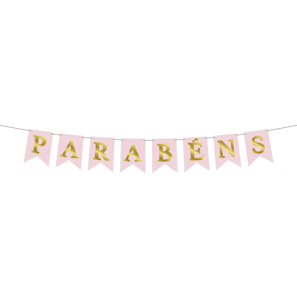 Utilize a Faixa Bandeirola Parabens Rosa e Dourada para deixar o ambiente da ainda mais especial e decorado. Produzida em papel cartao, acabamento metalizado de alta qualidade e facil montagem.