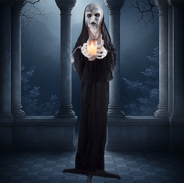 Transforme sua decoração em uma experiência arrepiante com essa figura macabra de freira, que vai se tornar o destaque do Halloween!