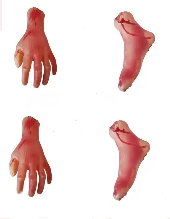 Kit Pé e Mão falso de plástico rígido. Pés e Mãos de plástico rígido resistente realístico assustador, membro decepado efeito realista, não prejudicial a saúde. Utilizado em festas, brincadeiras, eventos, cinema, teatro tv e muito mais.