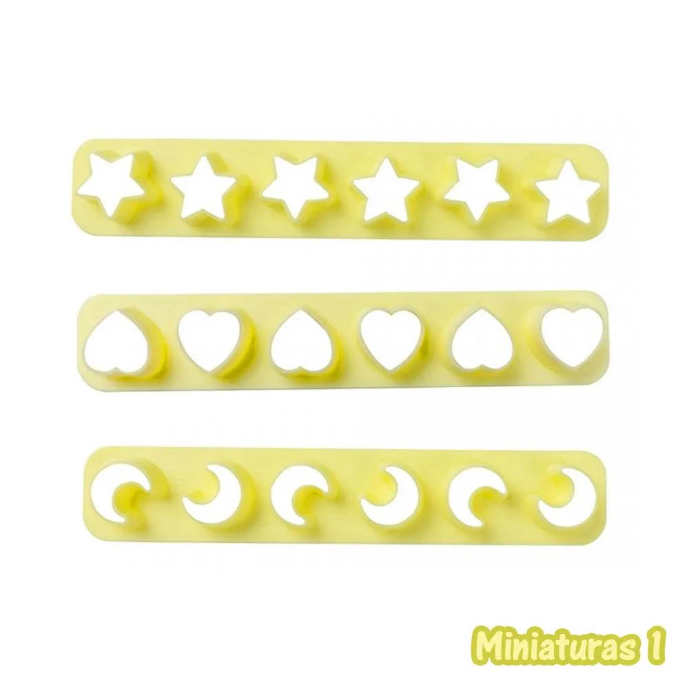 Brilhe nos detalhes com o Kit Réguas Miniaturas 1 da BlueStar. Cada embalagem contém três réguas diferentes, cada uma com a capacidade de cortar seis pecinhas de uma só vez. Este kit é composto pelas formas de: estrela, lua e coração. Crie lindos apliques para velas, topos de bolos, acessórios, lembrancinhas e muito mais! Produto indicado para cortar biscuit, pasta americana, porcelana fria, argila, pasta de açúcar, massa de modelar e massa de EVA.