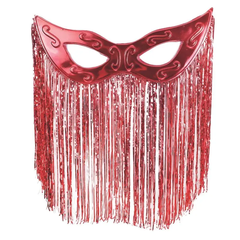 Máscara grande de plástico metalizado, com cortina na base, para decoração de paredes e para ser pendurada. Com 77 centimetros de largura e 100 centimetros de altura, a cortina segue o contorno da máscara e tem 70 centimetros de comprimento. Ideal para festas de carnaval e datas festivas.