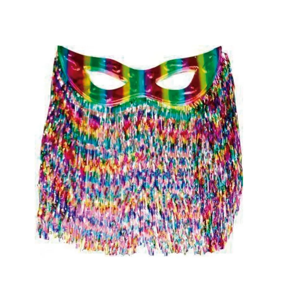 Máscara grande de plástico metalizado, com cortina na base, para decoração de paredes e para ser pendurada. Com 77 centimetros de largura e 100 centimetros de altura, a cortina segue o contorno da máscara e tem 70 centimetros de comprimento. Ideal para festas de carnaval e datas festivas.