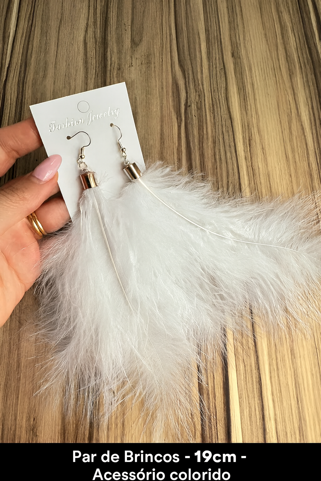 Par de Brincos de Penas Carnaval – 19cm – Acessório Cor Branco