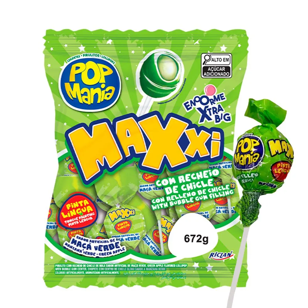 Pirulito Pop Mania Maxxi Maçã Verde Riclan 672g – Pacote com 24 Unidades