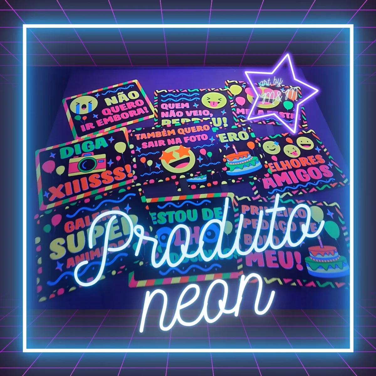O Kit Plaquinhas Divertidas de Neon deixam as fotos do seu evento super lindas, trazendo um ar de descontração, tendo então um charme a mais e muita alegria no seu evento. Compostas em material de qualidade, o papel cartão duplex 250g, garante estabilidade, firmeza e muita beleza com cores vivas e belas! As plaquinhas brilham apenas na luz negra, ou seja, em luz normal ou na ausência de luz não ficam brilhantes.