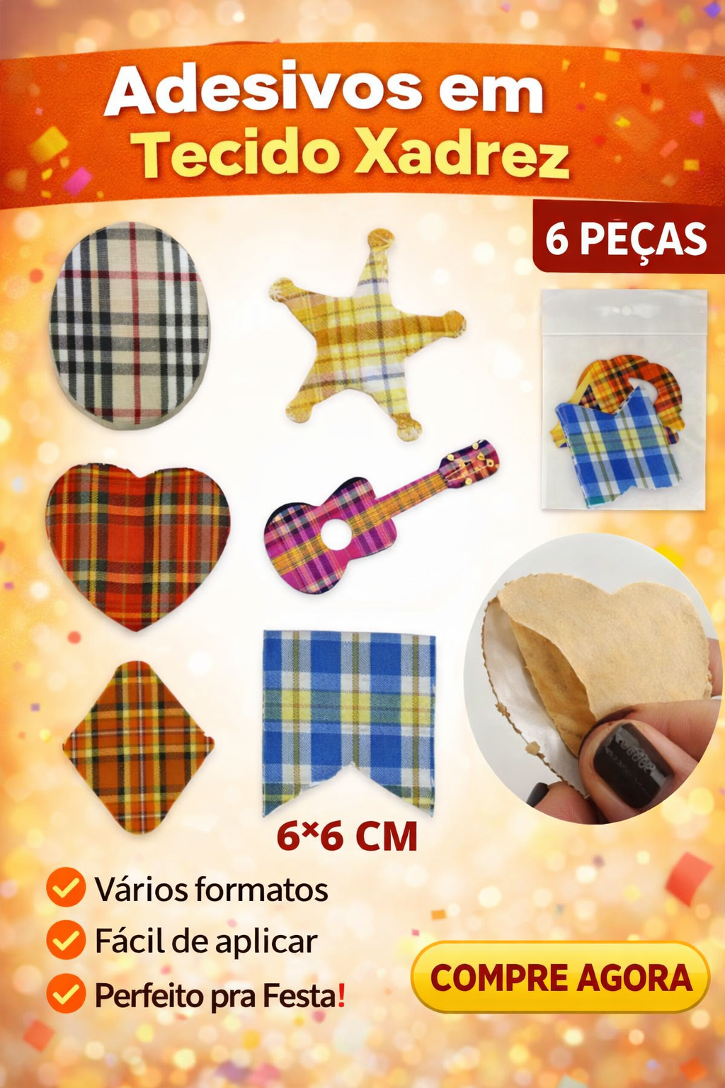 Os Remendinhos Auto Adesivos em Tecido são perfeitos para dar um toque junino em roupas, acessórios e decorações. Com estampas xadrez e formatos variados, são fáceis de aplicar e ideais para customizações rápidas.