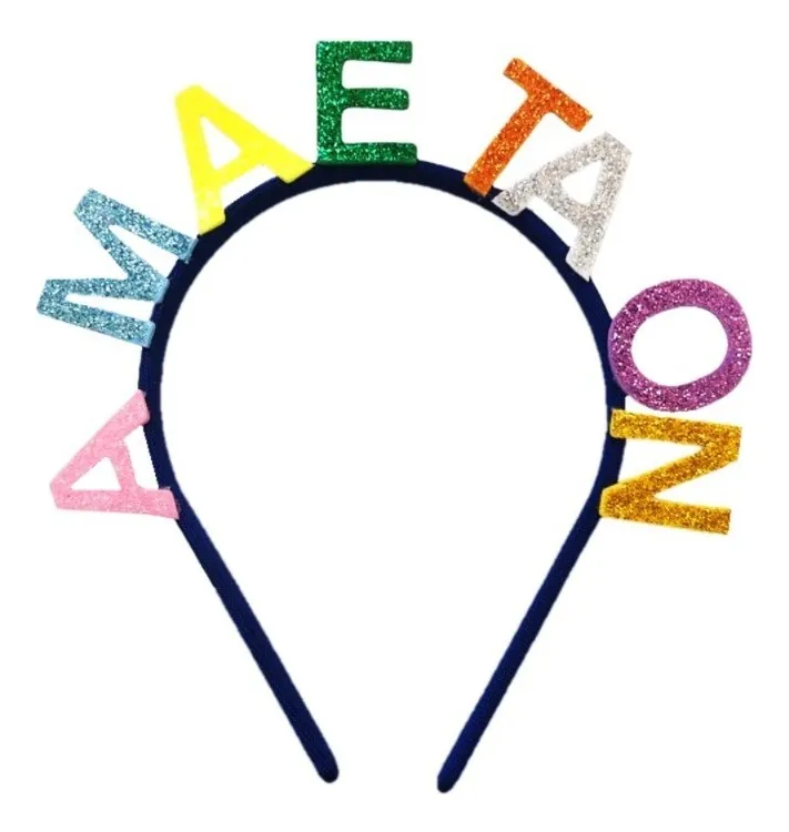 Com escrita colorida e acabamento brilhante, ela traz muito humor e estilo, além de ser leve e confortável para usar durante toda a festa.